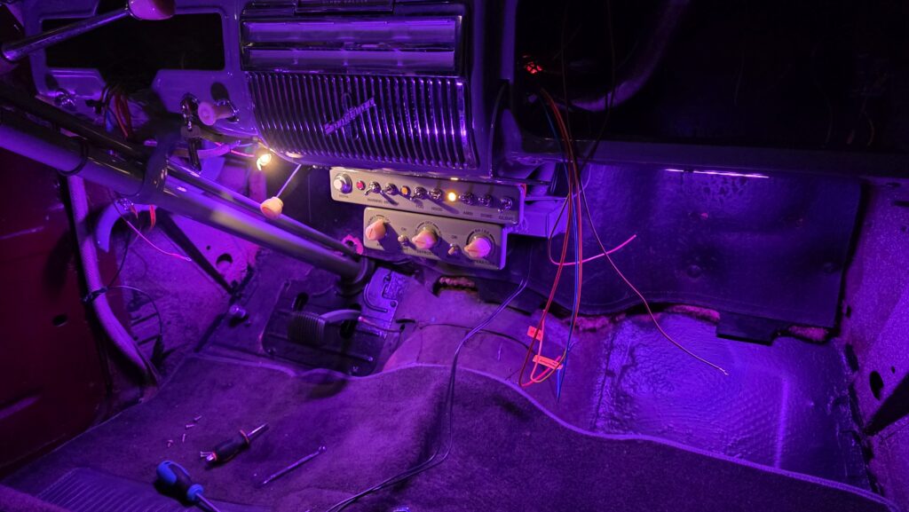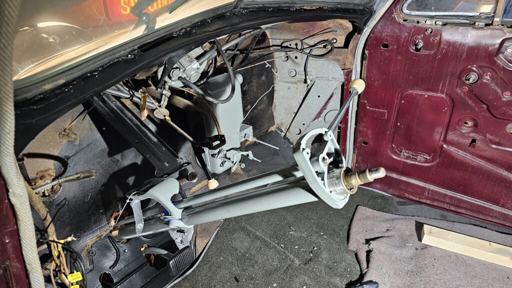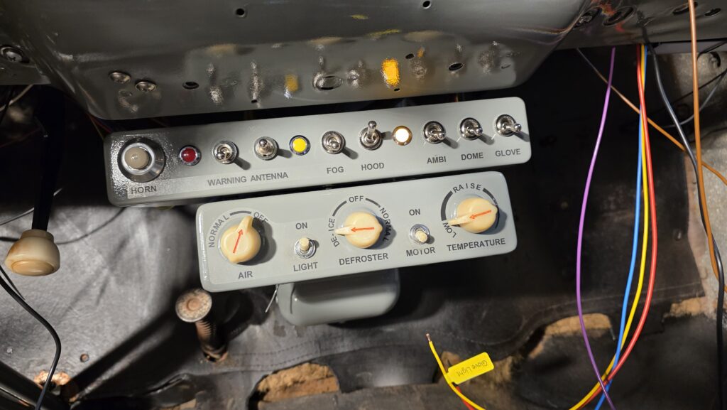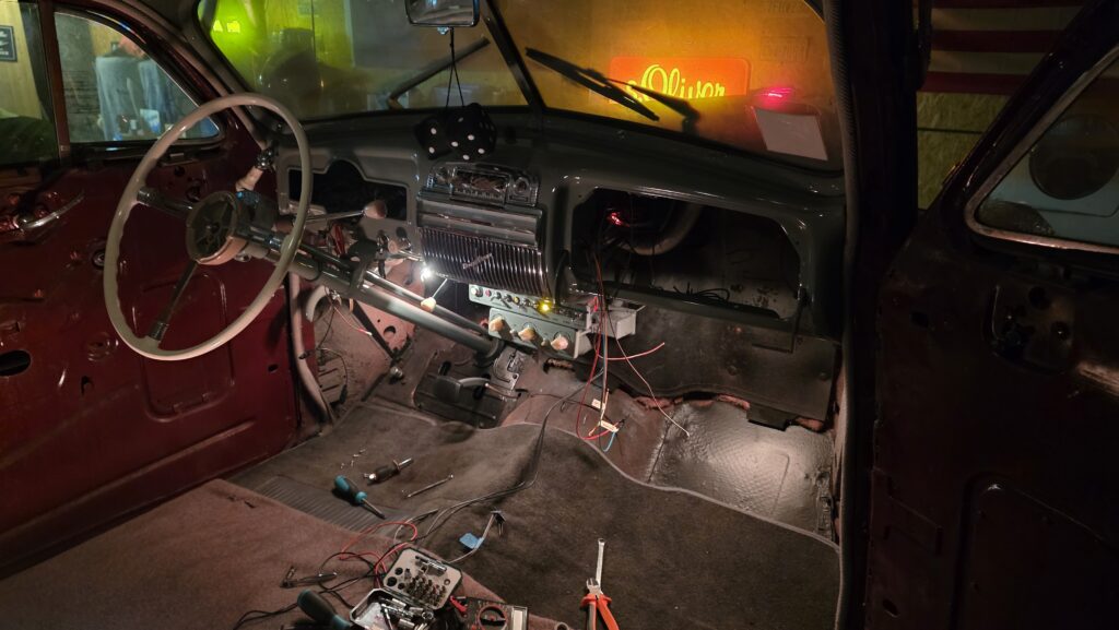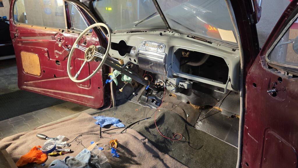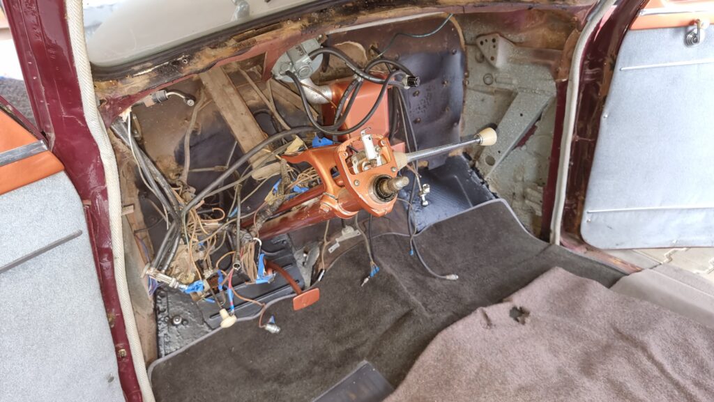 Vorne angekommen wurde allerdings schnell klar, dass es hier ohne größeren Aufwand nicht ging. Der orangefarbene Lack sollte verschwinden, dafür musste das Armaturenbrett ausgebaut werden. Dabei wurde sichtbar, dass die Elektrik in einem desolatem Zustand war und eine komplette Neuinstallation die beste Lösung ist.