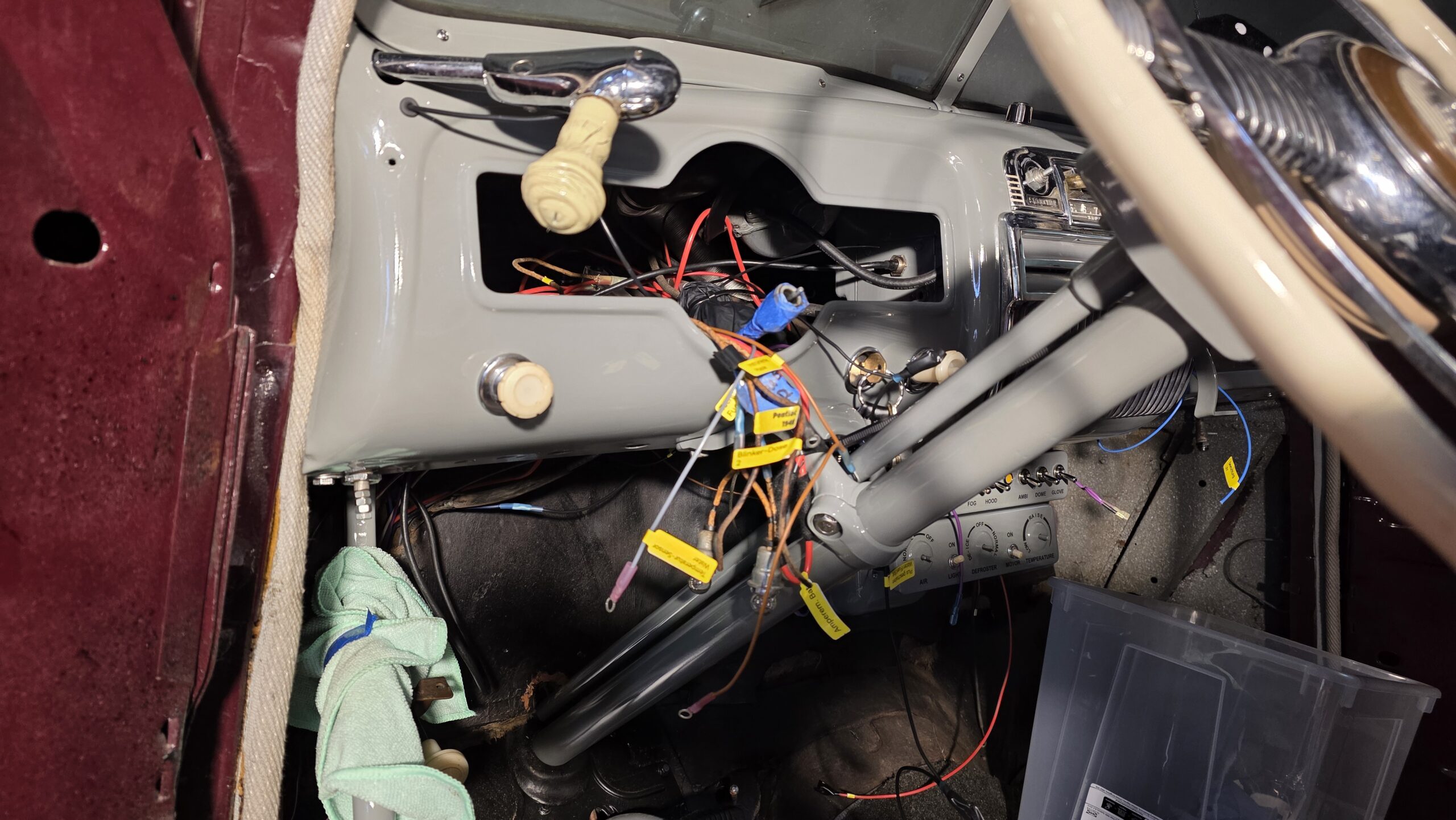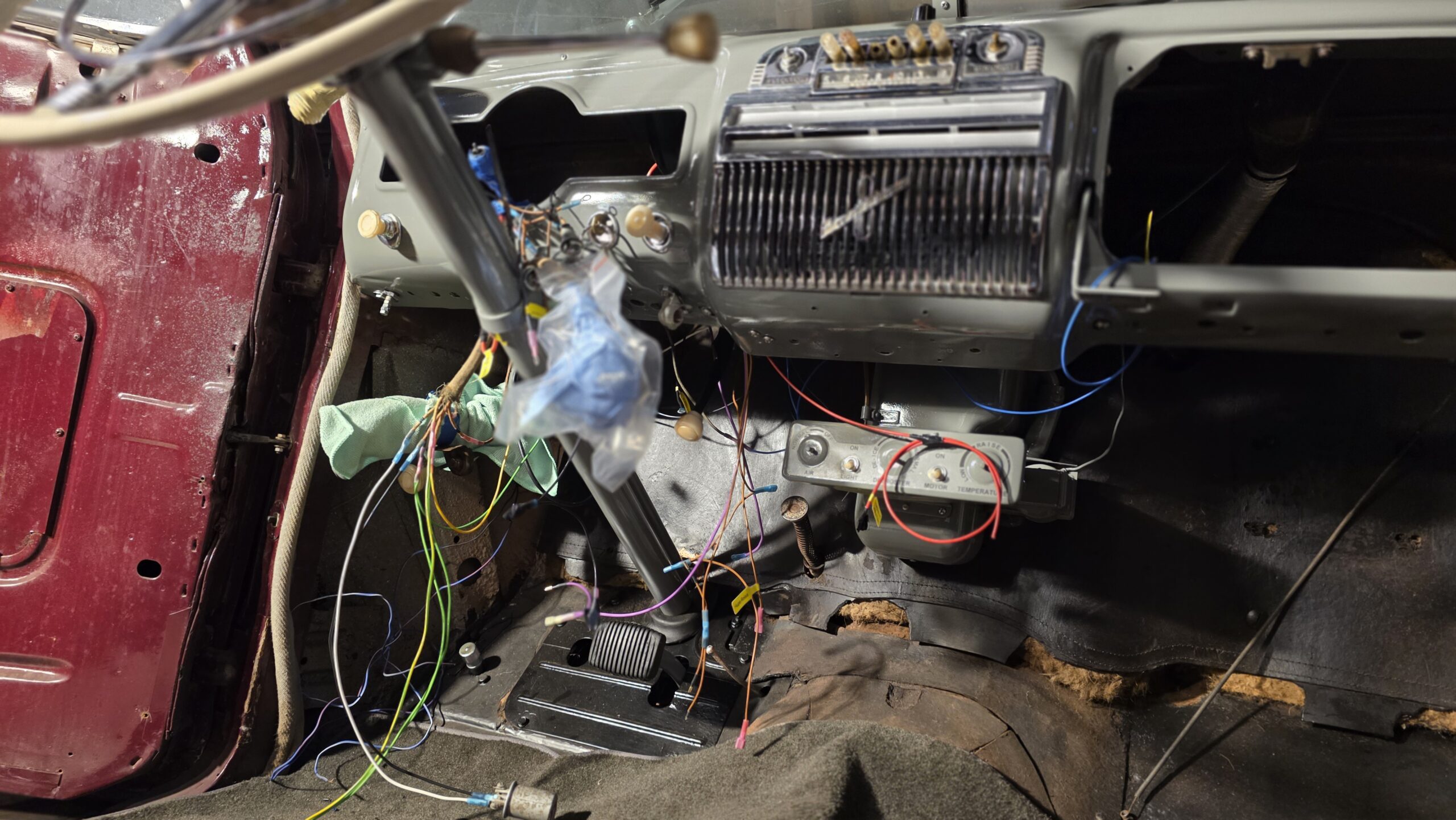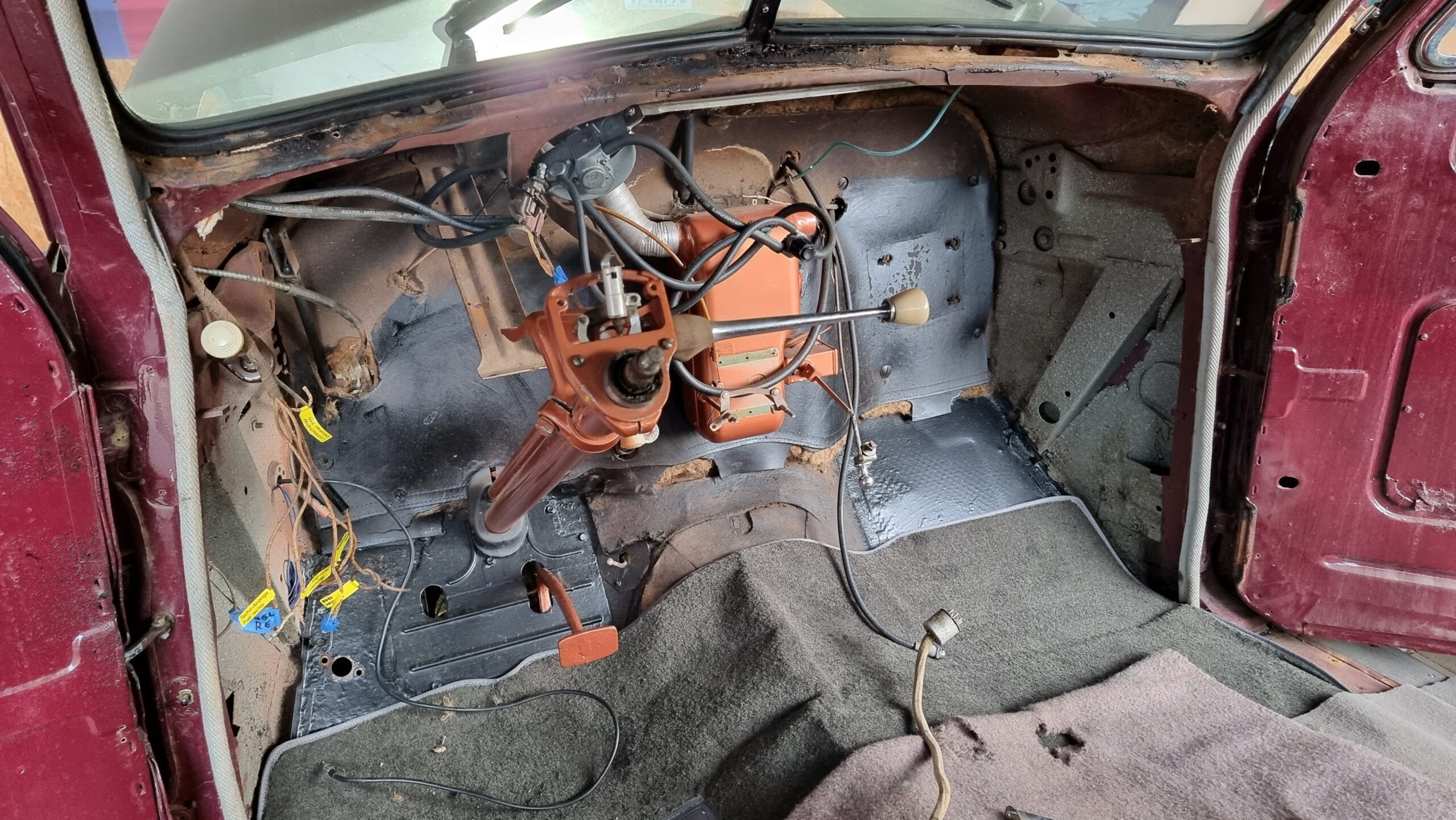 Vorne angekommen wurde allerdings schnell klar, dass es hier ohne größeren Aufwand nicht ging. Der orangefarbene Lack sollte verschwinden, dafür musste das Armaturenbrett ausgebaut werden. Dabei wurde sichtbar, dass die Elektrik in einem desolatem Zustand war und eine komplette Neuinstallation die beste Lösung ist.